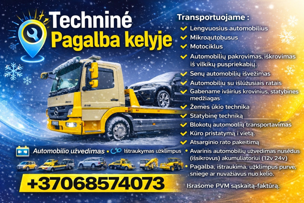 Techninė pagalba kelyje 24/7. Traliukas, tralas, autovežis. Automobilių, mikroautobusų, motociklų transportavimas. Krovinių, statybinės technikos, žemės ūkio technikos pervežimas. Atsarginio rato keitimas, kuro pristatymas, užvedimas.